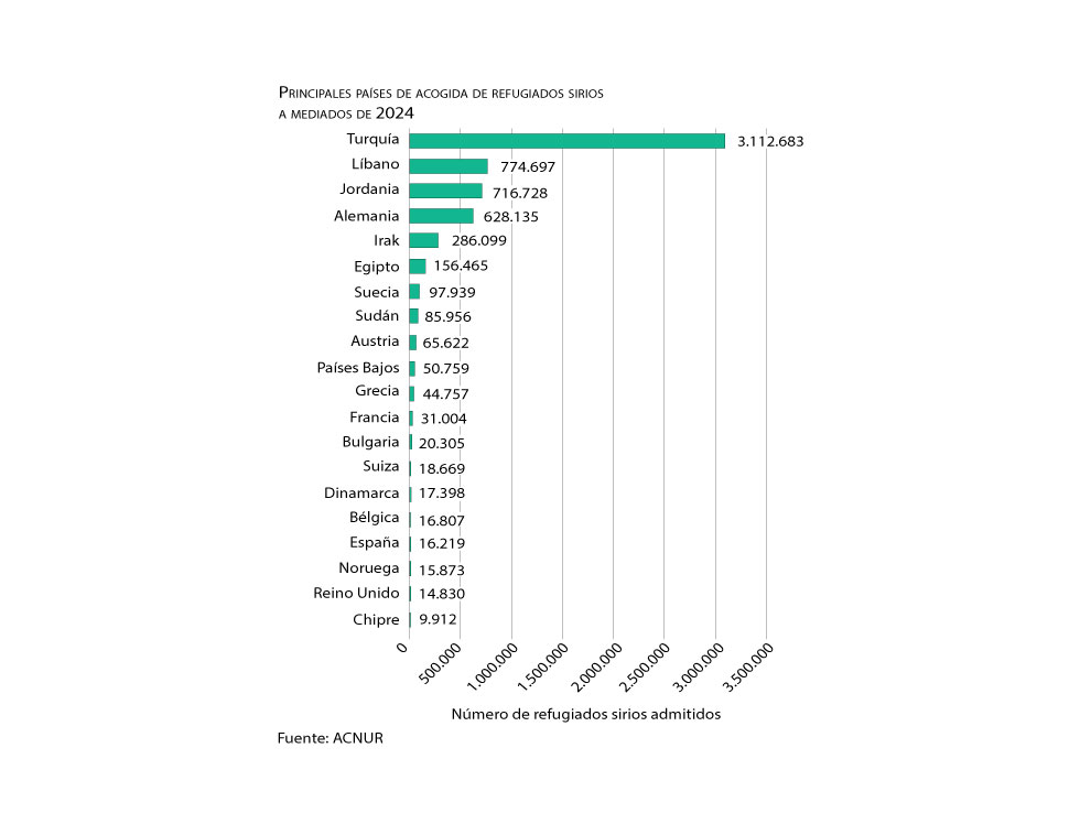 En 2024, la Agencia de la ONU para los Refugiados (ACNUR) registraba cerca de siete millones de sirios forzados a abandonar el país y otros 7,4 millones desplazados internamente. Los que han salido de Siria están repartidos entre 130 países, aunque la mayoría, 5,5 millones, vive en Turquía (3,6 millones) y también en Líbano, Jordania, Irak y Egipto.