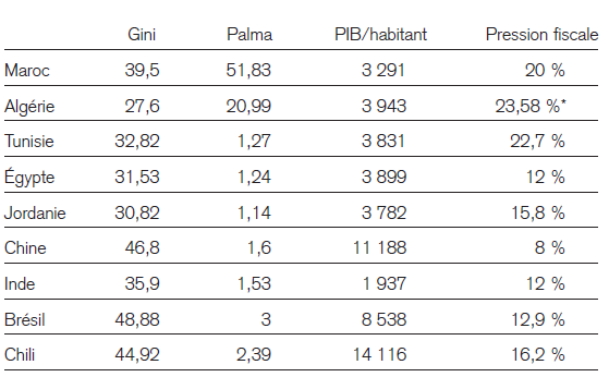 Le revenu moyen (PIB par habitant) au Maroc et en Tunisie se rapproche de ceux de l’Égypte et de la Jordanie, deux pays arabes ayant une structure économique diversifiée. Malgré cela, l’inégalité des revenus au Maroc et en Tunisie est plus élevée, ce qui pose des questions sur l’efficacité de la distribution des richesses créées par ces deux pays. Un autre fait marquant est celui de la pression fiscale au Maroc et en Tunisie qui est plus forte que dans d’autres pays en développement où l’on observe moins d’inégalité (un Gini ou un Palma moins élevé). Mis à part l’Algérie qui bénéficient de rentes significatives émanant du secteur des hydrocarbures, on observe l’incapacité des recettes fiscales des États du Maghreb central à répondre aux exigences sociales, notamment en matière de réduction de la pauvreté et des inégalités.