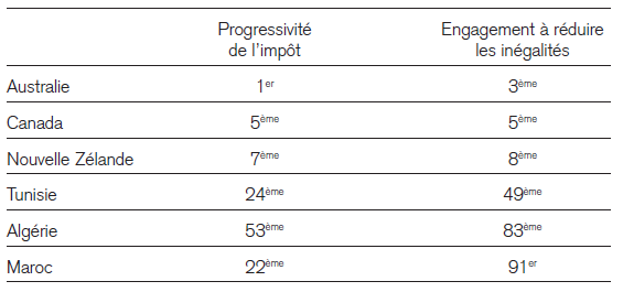 L’efficacité des politiques fiscales des pays du Maghreb dans la réduction des inégalités peut également être évaluée en fonction du degré de progressivité du barème fiscal. Le tableau 2 expose le classement de quelques pays selon l’indice d’engagement à réduire les inégalités économiques calculé à travers les mesures redistributives que les gouvernements peuvent prendre. Couvrant 161 pays pour l’année 2022, cet indice a été construit par Walker et al. (2022) pour le compte du Groupe Development Finance International et d’Oxfam. Le rapport classe aussi les pays en fonction du degré de progressivité de leurs barèmes fiscaux. On constate une corrélation positive entre cette progressivité et l’engagement des États à réduire les inégalités économiques. La progressivité fiscale dispose d’une marge d’amélioration significative dans les pays du Maghreb qui, dans le cas où elle sera exploitée, améliorera certainement leurs classements en matière d’engagement à réduire les inégalités.