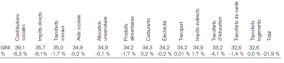 Le tableau 4 donne plus de détails sur la contribution estimée de chaque composante à la réduction de l’inégalité des revenus mesurée par l’indice de Gini.
