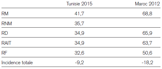 Touhami et Fouzia (2017) ont élaboré une méthodologie similaire afin d’analyser l’incidence fiscale sur l’inégalité des revenus au Maroc pour l’année 2012. Leurs résultats mettent en évidence une différence majeur par rapport à la Tunisie concernant l’incidence fiscale qui se situe principalement au niveau des dépenses publiques (en éducation et santé) (tableau 5). La contribution de ces dépenses au Maroc (le passage du Gini relatif au revenu après impôts et taxes et celui relatif au revenu final) dans la diminution de l’inégalité des revenus est significativement plus élevée que celle observée en Tunisie. En ignorant l’incidence des dépenses publiques, la comparaison indique une politique fiscale plus égalitaire en Tunisie (baisse du Gini de 41,7 relatif au revenu de marché à 34,9 relatif au revenu après impôts et taxes) qu’au Maroc (baisse du Gini de 68,8 à 63,7).