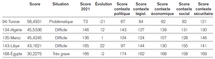 Selon le dernier classement annuel de la liberté de la presse dans le monde établi par Reporters sans frontières (RSF), aucun des quatre pays de la région n’obtient un score satisfaisant. La Tunisie, où le président Kaïs Saïed a organisé une sorte d’ « auto-coup d’État » au cours de l’été 2021, a perdu 21 places et occupe désormais la 94ème position, dans le groupe des pays où la situation des reporters est définie comme « problématique ». Les trois autres pays, l’Algérie (134ème), le Maroc (135ème) et la Libye (143ème) sont inclus dans la catégorie des pays où la situation est qualifiée de « difficile ».