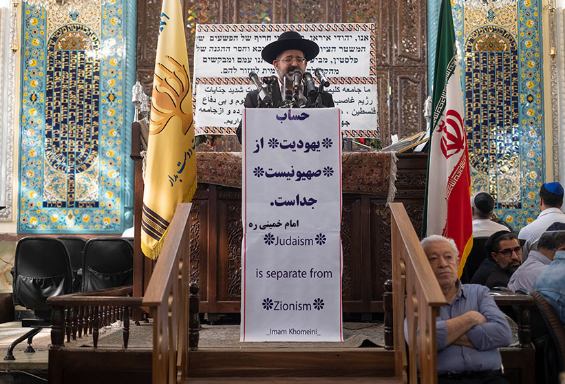 El rabino Younes Hamami Lalehzar, líder de los judíos iraníes, pronuncia un discurso en una sinagoga del centro de Teherán. 30 de octubre de 2023. (Photo by Morteza nikoubazl/nurphoto via Getty Images)