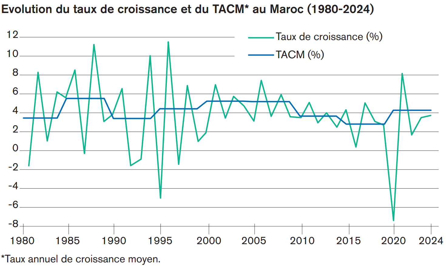 contre une performance l’année précédente de 4,6 %. Ce niveau de croissance converge avec la tendance des économies émergentes du continent, telles que l’Égypte ou le Nigeria. Il faut noter toutefois que la croissance économique au Maroc a longtemps (depuis les années 1980) été très volatile, due en grande partie à la dépendance sur l’agriculture pluviale (figure 1).