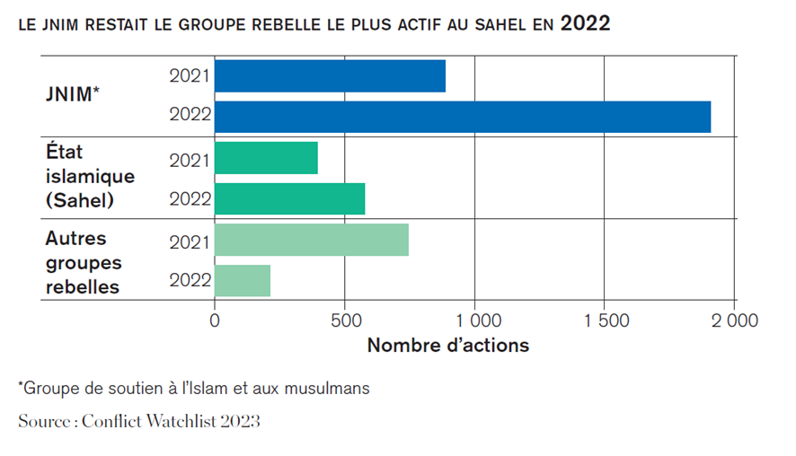 Ainsi, Iyad Ag Ghali, figure touarègue très réputée grâce à son rôle prépondérant lors de la révolte des an­nées 1990, a décidé de se dissocier des revendications sécessionnistes après l’éclatement d’une crise avec les nouvelles générations de l’élite touarègue, et a rejoint les rangs du djihad, en prenant la tête de sa nouvelle or­ganisation, Ansar Dine. Celle-ci a été créée en 2013 et, un peu plus tard, une autre entité peule est apparue, la katiba du Front de libération du Macina, qui a imposé son hégémonie dans le centre du Mali (connu sous le nom de Macina). Toutes ces organisations ont fini par fusionner pour créer la Jama’at Nusrat al Islam wal Muslimin (JNIM – Groupe de soutien à l’islam et aux musulmans), avec un seul chef visible, Iyad Ag Ghali.