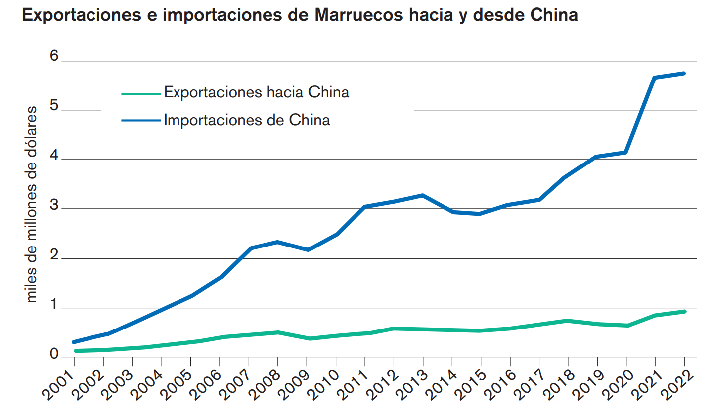 – Industria: a pesar de la desindustrialización de Marruecos, debido a la desaparición de su industria textil, el país parece haber reorientado su política económica de admisión temporal de materias primas para su transformación (también llamada admisión temporal), característica del sector textil, hacia industrias de mayor valor añadido, como la fabricación de baterías para vehículos eléctricos. China ya está construyendo su segunda fábrica de baterías para vehículos eléctricos para BTR New Material Group, que también se beneficia de materias primas locales como el cobalto y el fosfato, necesarios para la fabricación de baterías de iones de litio. Por otro lado, China prevé construir una central térmica de carbón en Yerada gracias a un préstamo comprador. También está en curso un proyecto de gigafactoría por valor de 6.500 millones de dólares, el primero de este tipo en el continente africano.